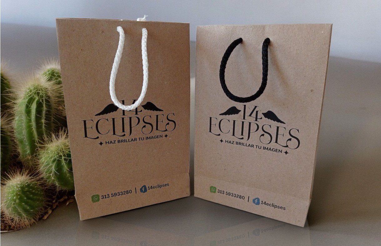 • Fabricación en material de alta calidad:  Papel kraft, tono mate, gramaje 120, asas de gran resistencia en cinta satín, cordón, cabuya y manija de papel, esta bolsa asegura la protección y presentación de tus productos.